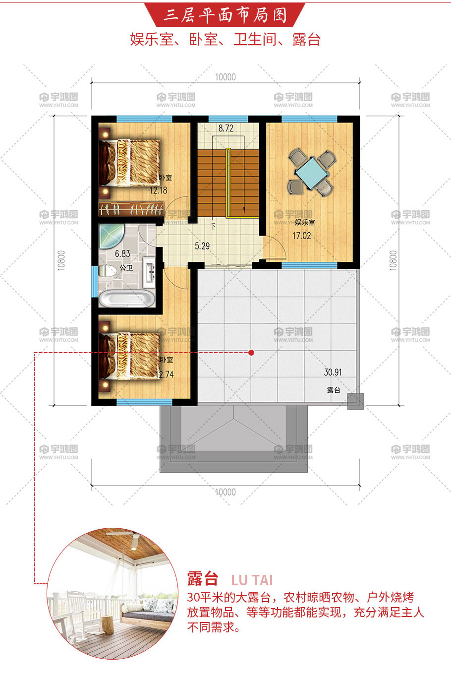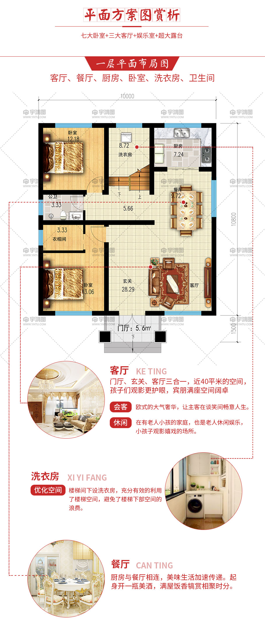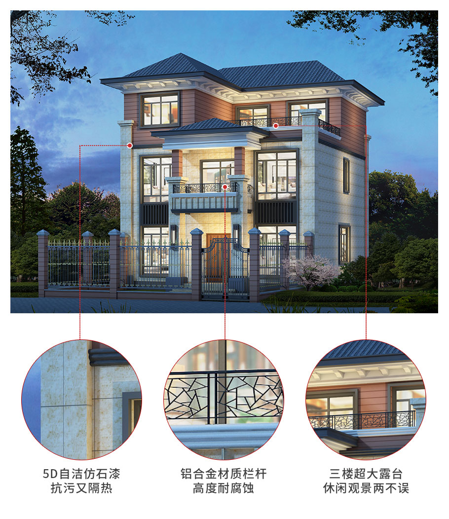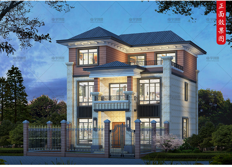 2021新款農村三層歐式別墅設計圖紙,本戶型為農村三層歐式風格別墅設計圖,復式結構中空客廳,戶型尺寸為10×12.3米,該戶型外觀主要以暖色系裝飾,坡屋頂高低錯落很有層次,外立面結構豐富,色彩搭配簡潔大方,室內布局規劃合理精確,主臥帶有衣帽間,三層設有大露臺,適合現代新農村建房。