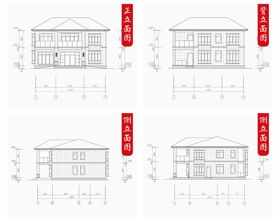 建筑立面圖:東立面圖,西立面圖,南立面圖,北立面圖,剖面圖;