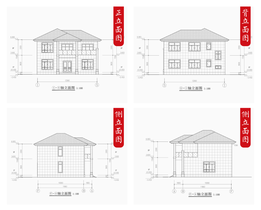 建筑圖: | 建筑平面圖:一層平面圖,二層平面圖; 建筑立面圖:東立面圖,西立面圖,南立面圖,北立面圖,剖面圖; 大樣圖:樓梯詳圖,細部大樣,門窗大樣 |
